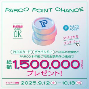 キャンペーン期間中にアプリ「POCKET PARCO」から配信されるクーポンにエントリーのうえ、PARCO本年度ご利用金額5万円以上の達成とPARCOカードまたはポケパル払いで税込2,500円以上(期間中合算可)お買い上げいただいた方の中から抽選で300名様に5,000円分のPARCOポイントをプレゼント!